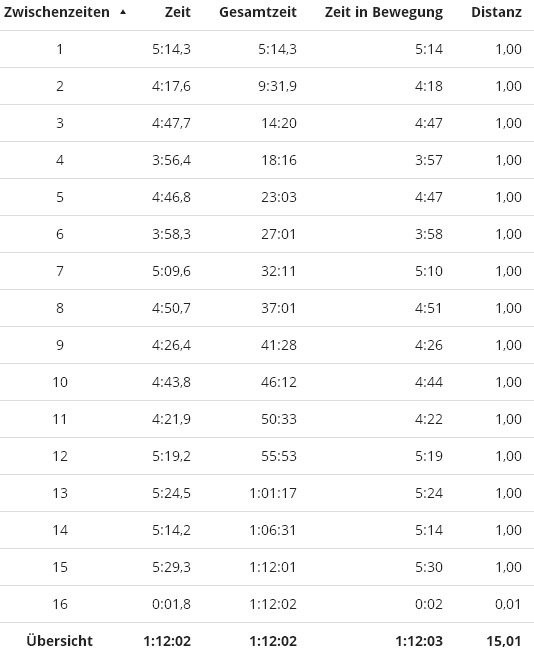 Strecke: 15,01 km; Zeit: 1:12:02; Pace: 4:48; Puls: 170/185; Trittfrequenz: 169/255