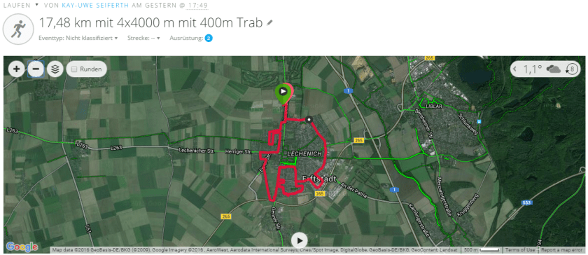 Am Mittwoch dann die nächste Einheit: 4 x 4000 in 4:25 je Kilometer. Bei dieser Einheit habe ich mir eigentlich keine großen Gedanken gemacht. Aber schon am Ende der ersten 4 Kilometer wurde mir bewusst, das wird doch ein wenig härter. Diese bin ich in einem 4:20 Schnitt gelaufen, aber noch fühlte ich mich gut. Die nächsten 4 Kilometer nach einem verdammt kurzen Trab von 400 m liefen dann sogar noch etwas schneller, der Schnitt 4:19. Aber jetzt musste ich schon die ersten 100 Meter gehen.