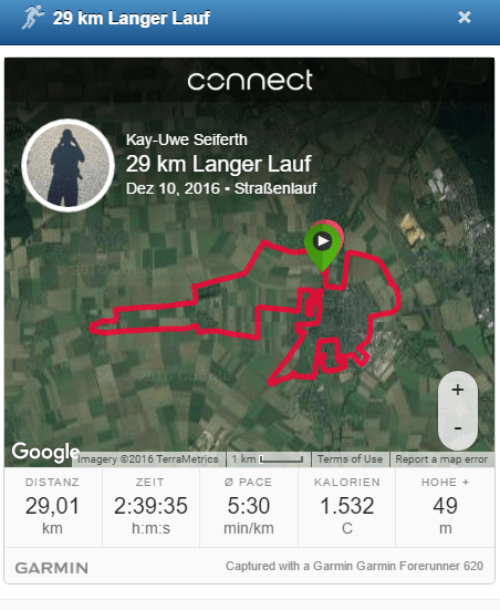 Strecke: 29,01 km; Zeit: 2:39:35; Pace: 5:30; Puls: 147/166; Trittfrequenz: 161/177