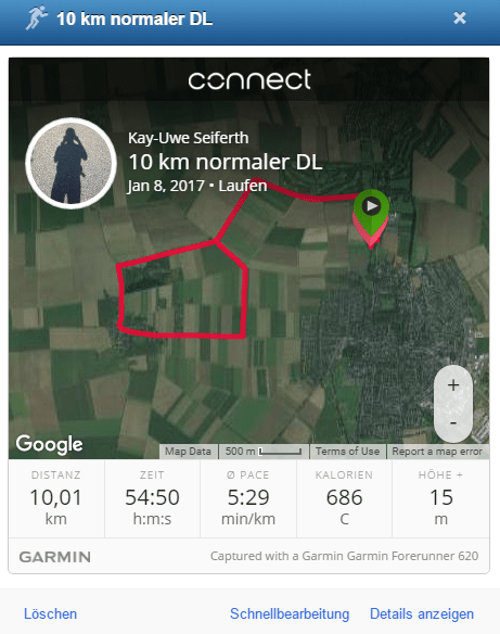 Ich war gespannt, wie denn dann heute meine Laufstrecke aussehen wird. Es hatte weiter geregnet heute Nacht, aber schon beim Brötchen holen heute Morgen um 7.00 Uhr war alles wieder gut. Zumindest in unserer Gegend hier. Da stand einem schönen 10 km Lauf nichts mehr im Wege. Beim Start spürte ich leider mein Knie wieder, es ist einfach nicht schön. Da will man soviel und wird irgendwie ausgebremst, aber davon lasse ich mich nicht unterkriegen. Um das Knie beim Auftreten zu entlasten, bin ich ganz extrem auf dem Vorfuß gelaufen, fast schon auf Zehenspitzen. Das war schon recht anstrengend, aber für mein Knie echt super. Allerdings so nach 5-6 Kilometern waren beide Waden, rechts und links so verhärtet, dass ich nach dem Lauf echt Probleme hatte, die Treppe runter zu gehen. Fast wie nach einem Marathon 😉
