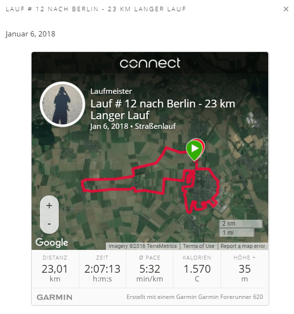 Strecke: 23,0 km; Zeit: 2:07:13; Pace: 5:32; Puls: 159/176; Trittfrequenz: 161/255 (?)