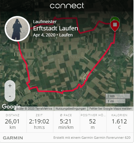 Trotzdem, schöne 26 km gelaufen, das Wetter hat gepasst, leider natürlich die Umstände in der jetzigen Zeit nicht, aber auch das werden wir überleben.
