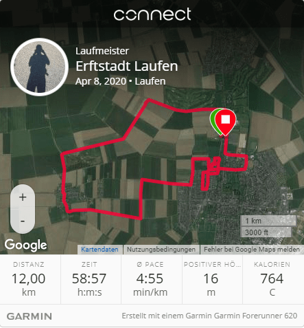 Strecke: 12 km; Zeit: 58:57; Pace: 4:55; Puls: 158